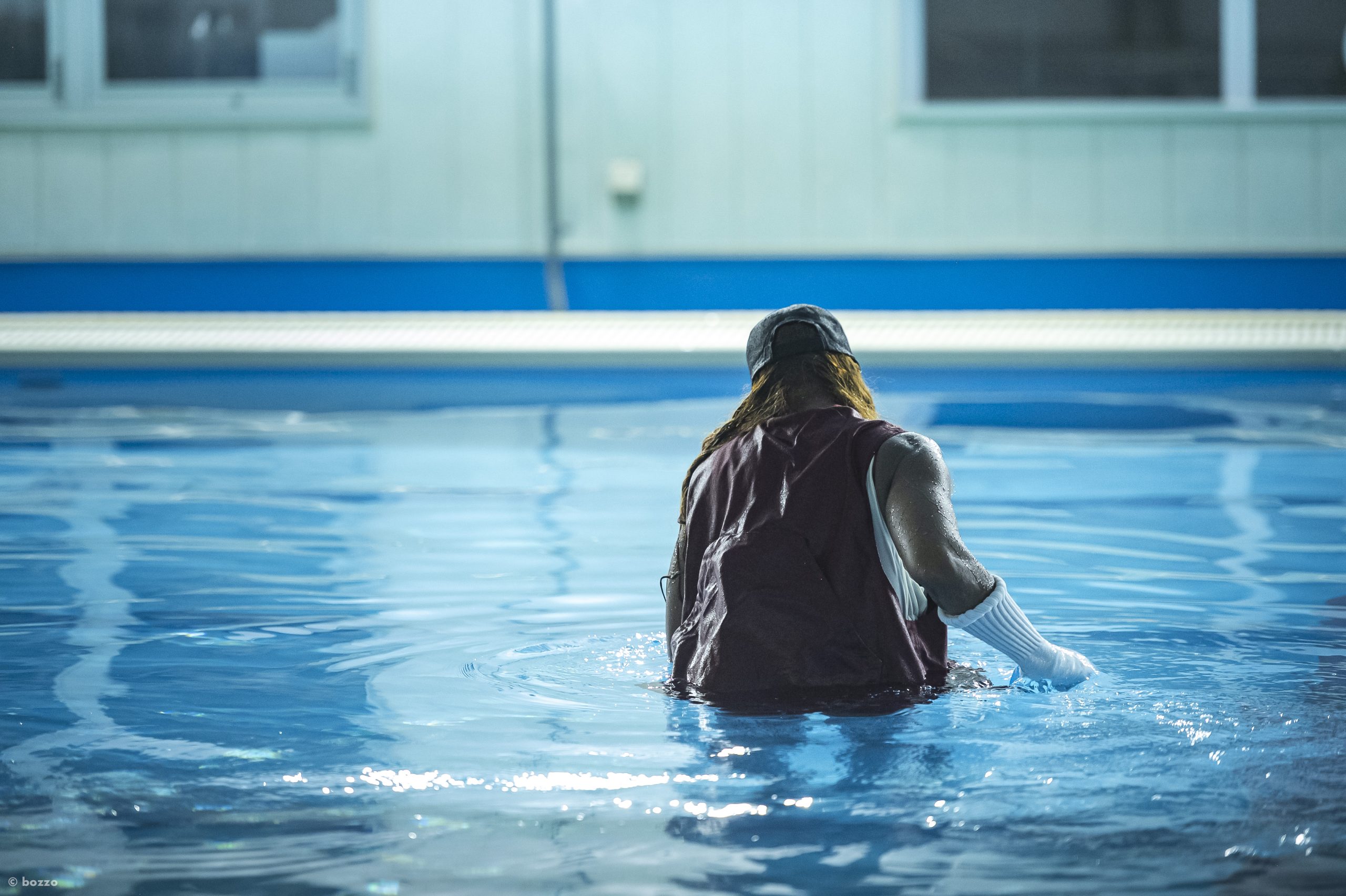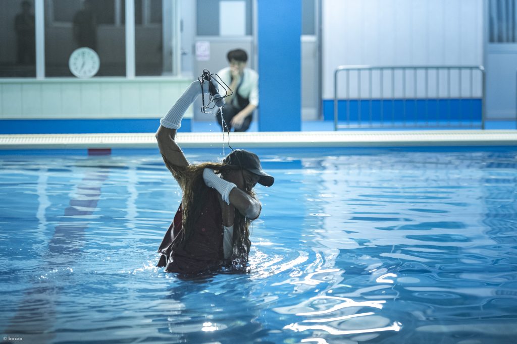 カナダのライブ・アーティスト、デイナ・ミシェルの新作『IN WATER I MUST』のクリエーションは、彼女自身が「なぜ泳げないのか」というシンプルな問いから始まっている。城崎国際アートセンターでの滞在制作の成果発表は『SWIMSUIT EDITION』と題して、市立プールを貸し切って行われた。