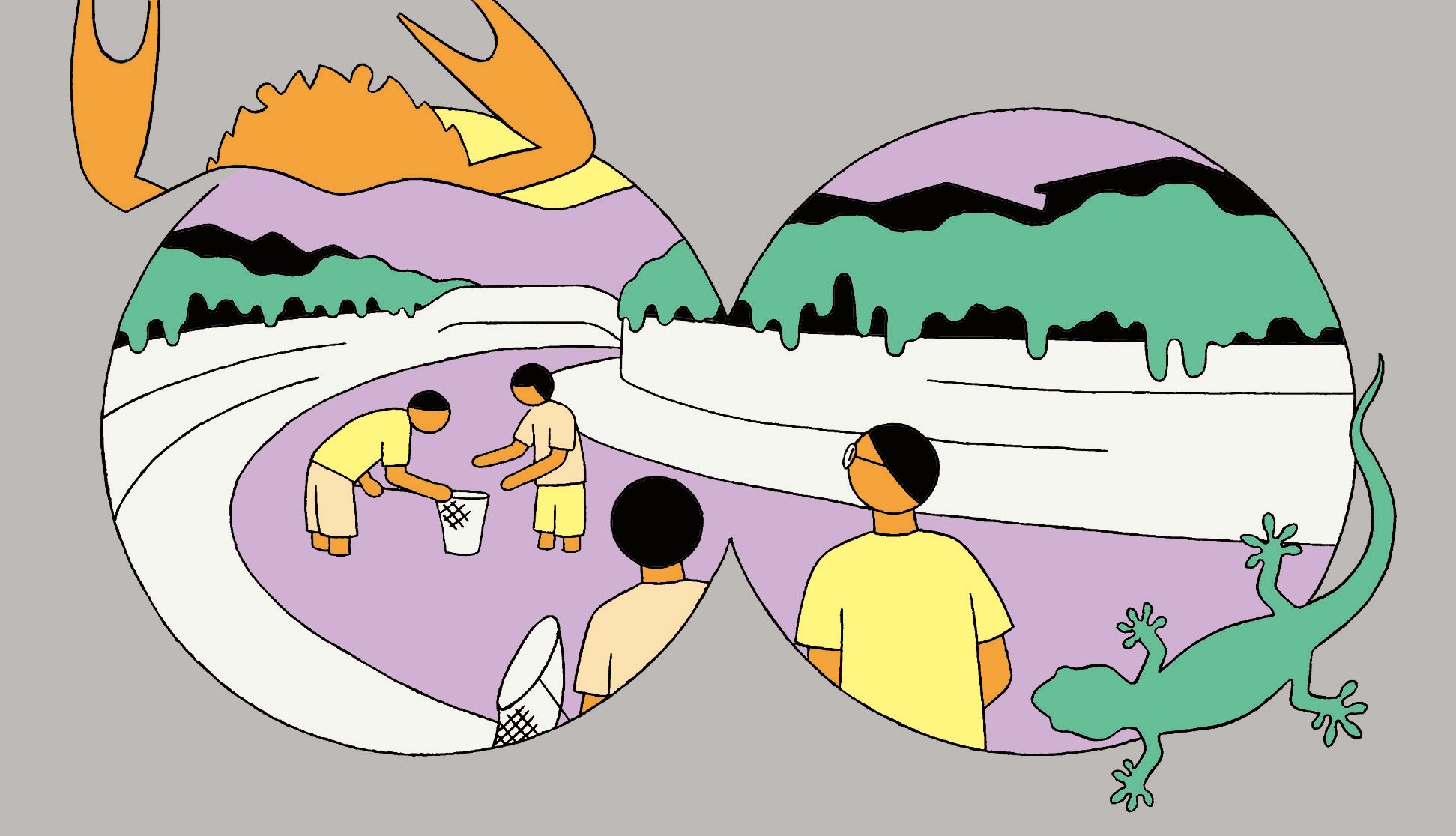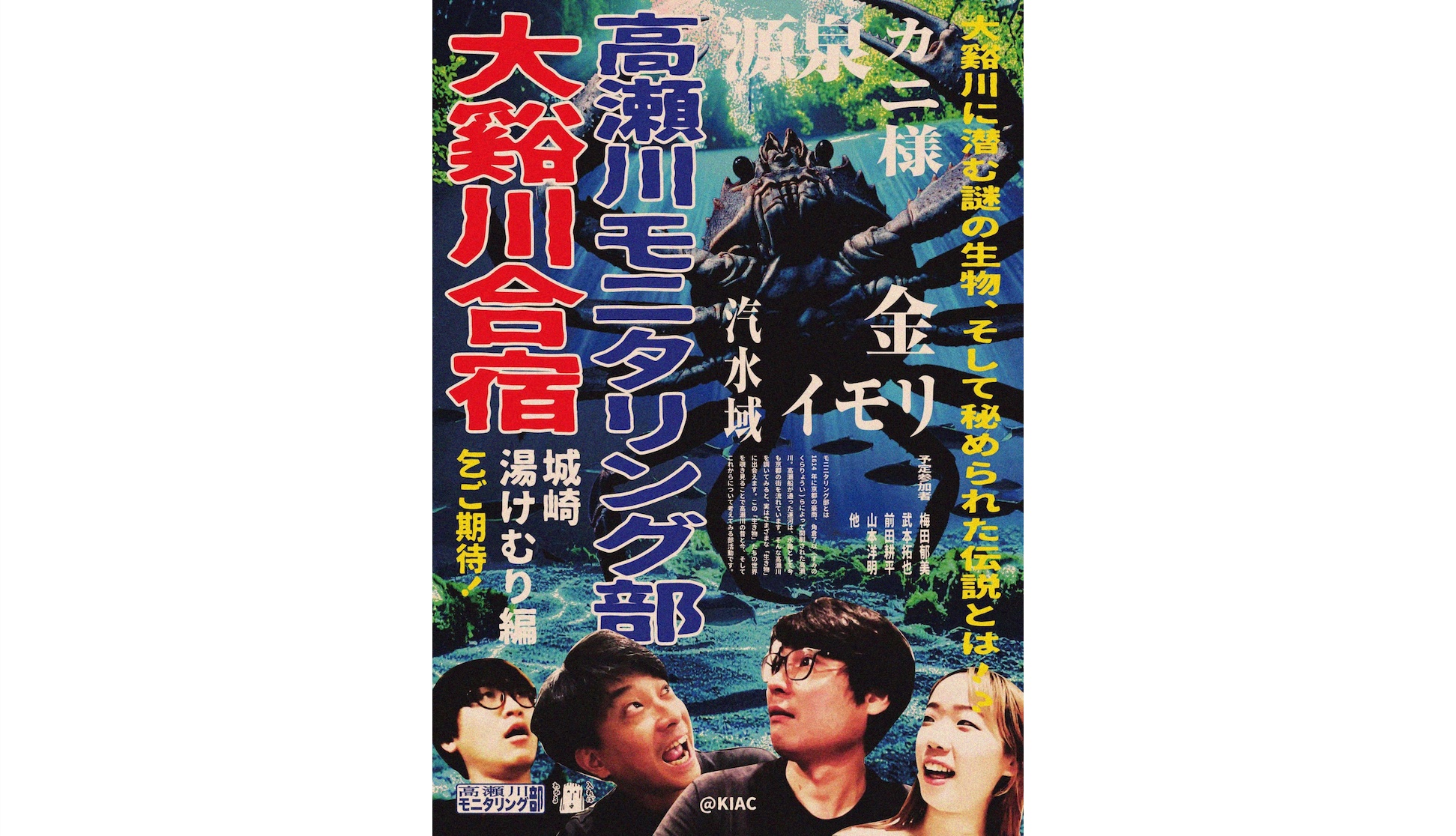 京都の町中を流れる高瀬川をフィールドに、川に棲む生き物に着目し、その観察と記録を通して川と人との関係性を探ってきたアーティストらによる部活動「高瀬川モニタリング部」による合宿企画。城崎の温泉街を流れる大谿川を舞台に、生き物の観察や記録を行い、川を内外から捉え直す。部として重ねてきた「さがす」方法によるモニタリングを、地域の人々とともにワークショップ形式で実践。大谿川が円山川を経て汽水域へとつながる流れにも着目し、新たな領域との接続を視野に、モニタリングフィールドの拡張を試みる。